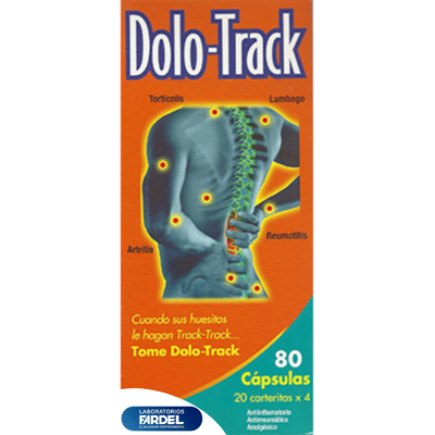 Antiinflamatorio-Antirreumatico-Analgésico DOLOTRACK: Es un antiinflamatorio que posee actividades analgésicas y antipiréticas. Está indicado para el tratamiento de enfermedades reumáticas agudas, artritis reumatoidea, espondilitis anquilosante, artrosis, lumbagia, gota en fase aguda, inflamación post-traumática y post-operatoria, cólico renal y biliar, migraña aguda y como profilaxis para dolor post-operatorio y dismenorrea (dolor de vientre). Indicado también para el tratamiento de las neuritis y neuralgias.