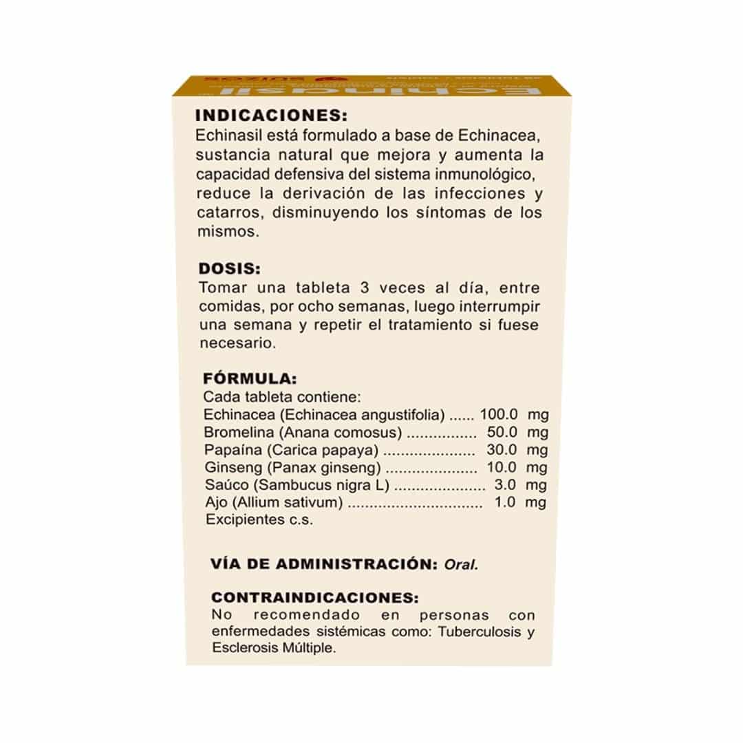 Echinasil está formulado a base de Echinacea, sustancia natural que mejora y aumenta la capacidad defensiva del sistema inmunológico, reduce la derivación de las infecciones y catarros, disminuyendo los síntomas de los mismos.